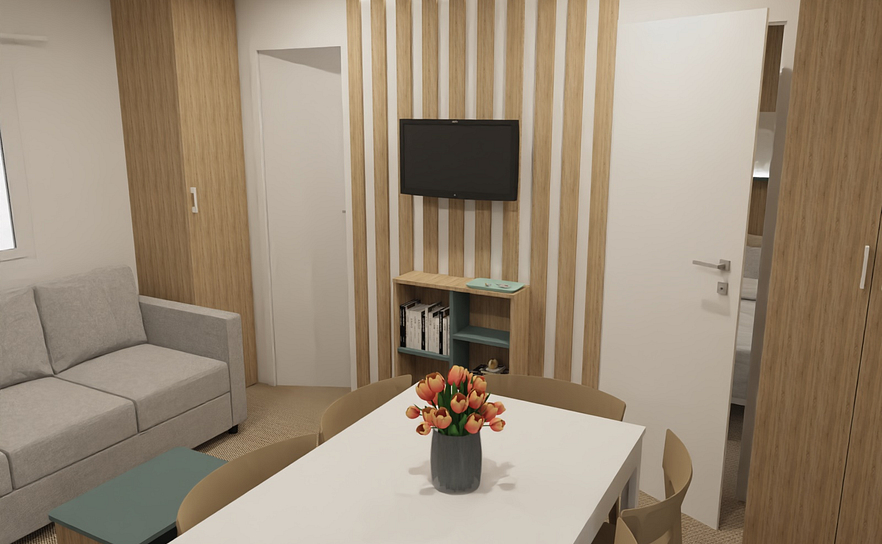 El mobilhome Sunny Azur té capacitat per 4 adults + 1 infant, disposa de dues habitacions i sofà llit