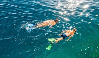 C’est l’heure de la baignade et du snorkeling ! Les enfants nagent au milieu des petits poissons pendant que vous explorez les rochers…