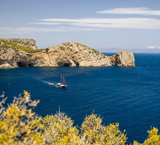 Le bateau ralentit pour entrer dans la fameuse grotte de la Foradada, tunnel naturel creusé par la mer. Lumière magique, échos marins, éclats de rire : c’est un moment hors du temps.