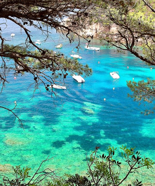 Mouillage dans une crique secrète, accessible uniquement par la mer. L’eau est d’un bleu translucide.