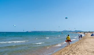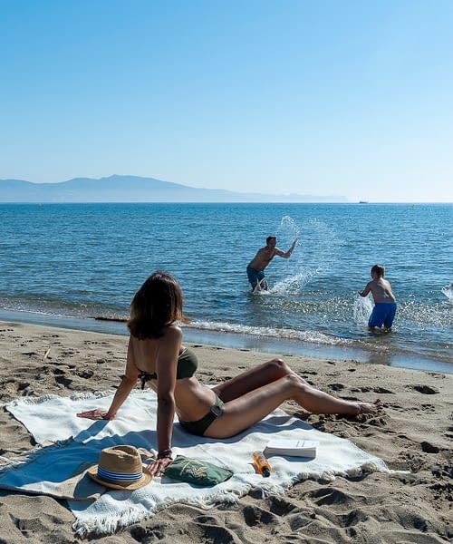 Vous retrouvez la petite équipe sur la plage devant l’Amfora : serviettes, chaises pliantes, parasols ils sont parfaitement équipés !
