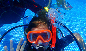 Cap a la piscina de l’Amfora per a fer una iniciació al submarinisme amb Guaita Diving, el col·laborador del càmping.
